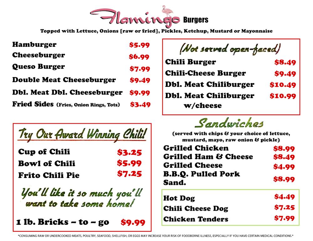 Flamingo Lounge’s menu features an array of options. Burgers are the star of the show, with varieties like the classic hamburger and the chili burger. Each burger brings robust flavors and generous portions. The chili stands out, served in bowls or as a Frito pie.