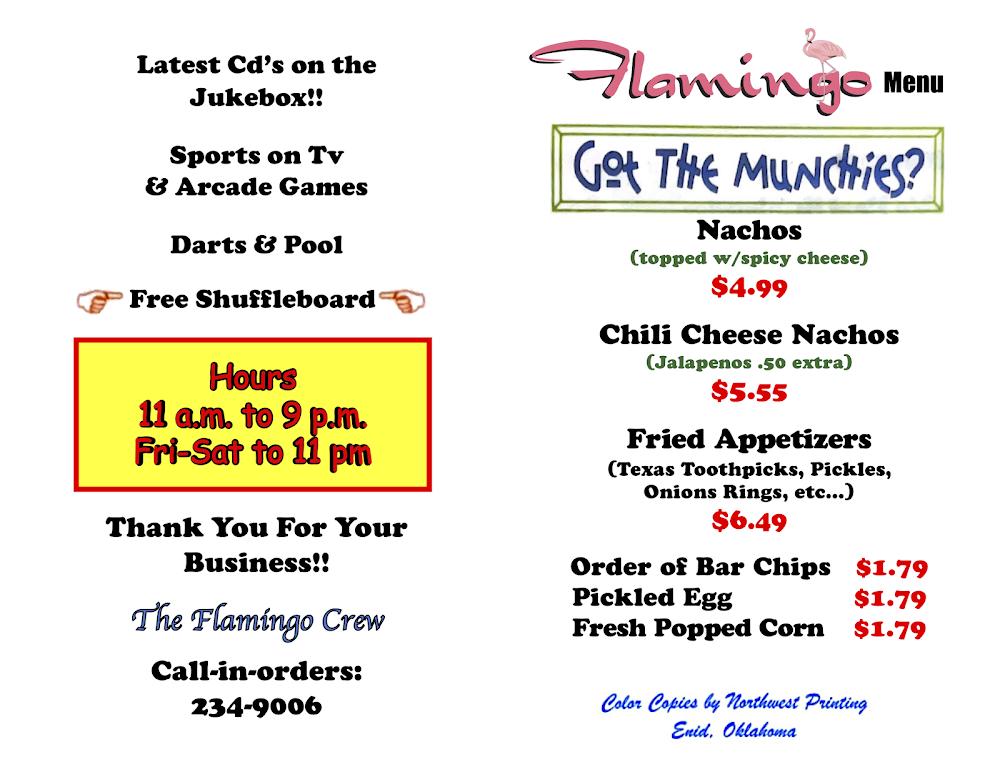 Welcome to Flamingo Lounge, the oldest burger restaurant in Northwest Oklahoma, serving delicious burgers and cold beer since 1958! Located at 520 S Van Buren St, Enid, OK, our lively atmosphere is perfect for a casual meal, a night out with friends, or a solo dining experience. Enjoy a wide selection of beers, dive into our famous chili, and challenge your friends to a game of pool or shuffleboard. With accessible amenities, a relaxed vibe, and exciting happy hour specials, Flamingo Lounge is the ideal spot to unwind. Join us for great food, fun games, and unforgettable moments!